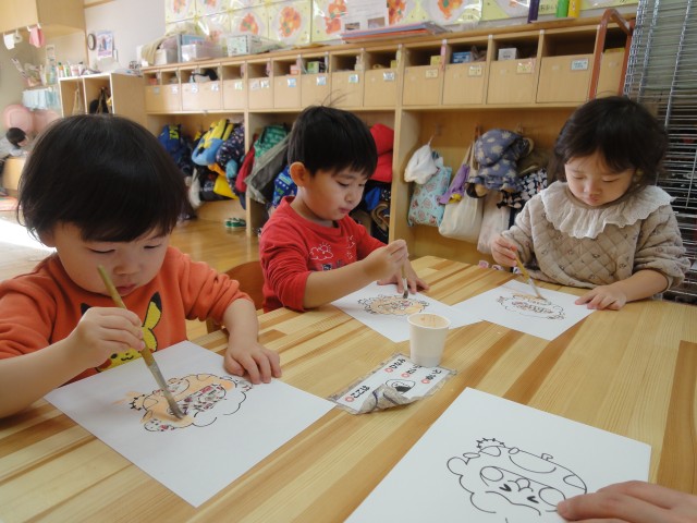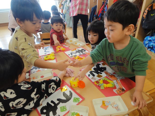 すみれさんとさくらさんは、書初めをしました。すみれさんはうま年なので『うま』と書きました。さくらさんは自分の名前を書き、乾いたら手形を押すとのことでした。書くと言っても、自分一人で字を書ける子はあまりいません。ほとんどの子どもたちは先生に手を持ってもらい書いていましたよ。それでも、白い半紙に黒い墨で字が書けると、それぞれ味があっておもしろい作品になっていましたよ。