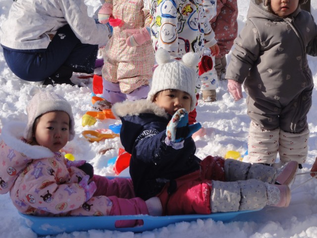 つぼみさんとたんぽぽさんはお外に出て遊びました。たんぽぽさんは、園庭にできた小さな坂に上ったり滑ったり雪まみれになって遊んでいましたよ。雪玉製造機で雪玉を作ったり、ソリに乗ったり引っ張ったりと、みんな雪遊びを楽しんでいました。
