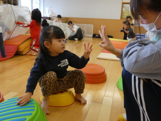 たんぽぽさんはサーキットでトンネルや、マットの小山などで体育遊びをしていました。指を二本でピースサインを練習していたお友だちがいました。ピースは上手にできたので『3』の練習をしました。2はできても3はちょっと難しいようでした。もう3歳なので 『3』ができるようにとがんばっていましたよ。