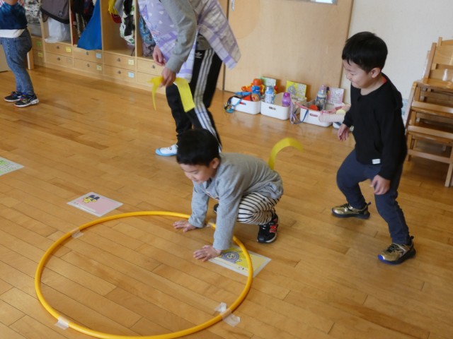 さくらさんは、二人一組になって、しっぽ取りゲームをしていました。シッポを付けている人はフープの中に手をつきながらフープの周りを逃げます。そしてもうひとりのお友だちはしっぽを追いかけます。逃げるのが早くてなかなか取れないようで、いっぱい走っていました。