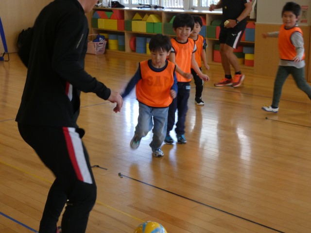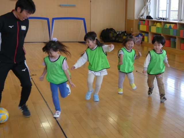 今日はちゅうりっぷ組のサッカー教室がありました。サッカーというと、ボールを蹴ってゴールに入れるゲームですが、まずはボールと仲良くなることの練習から始まります。ボールとお散歩したり、ボールに座ったり、ボールの上に片足を乗せて静止するのも、体幹がしっかりしていないとグラグラしてしまいます。そして、最後はコーチ対子どもたちでゲームをしました。みんなとっても上手!オウンゴールをすることなく、しっかりとゴールを決めていました。