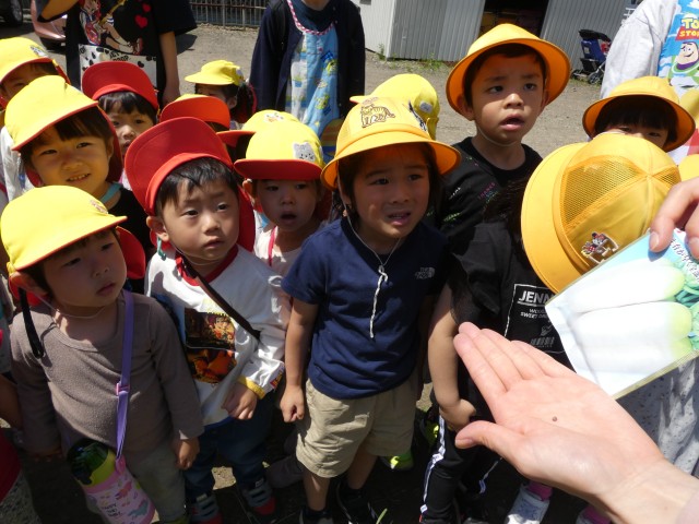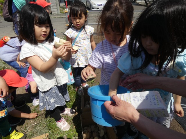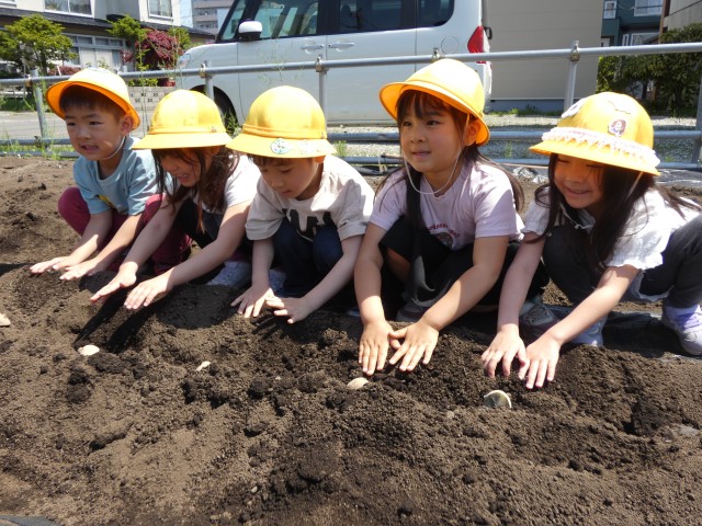 今日は、ちゅうりっぷさんとさくらさんがじゃがいもを植えました。じゃがいもは日光が嫌いなので、しっかり土で覆っていました。すみれさんも見学にやってきて芽の出ているおいもを不思議そうに見ていましたよ。「この芽が段々と伸びてきて、葉っぱが出てきておいもができてきます」とお話をしましたが、「おいもはリンゴやきゅうりみたいに土の上になるのかな?」と聞くと、みんな大きく頷いていました。「イヤイヤ、おいもは土の中で育つんですよ」と伝えましたが、百聞は一見に如かず、収穫の時が楽しみですね。