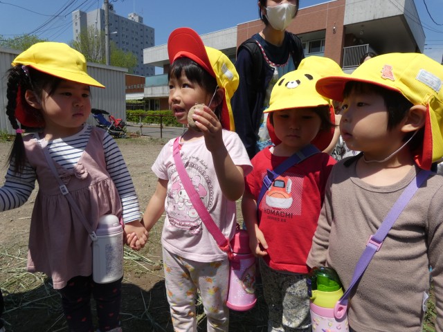 ちゅうりっぷさんとさくらさんはもくれん公園に、すみれさんはライラック公園に、たんぽぽさんはこぶしさくら公園に、つくしさんは舞鶴公園にと、各クラス、それぞれの公園にお散歩に出かけて行きました。