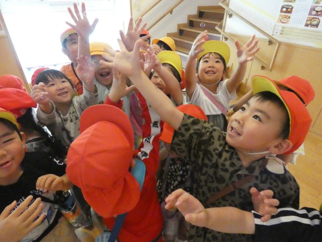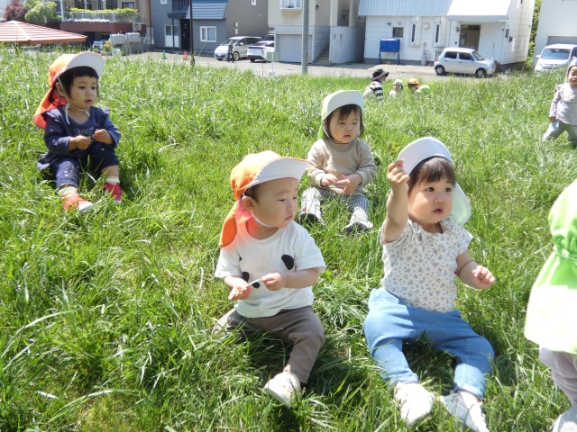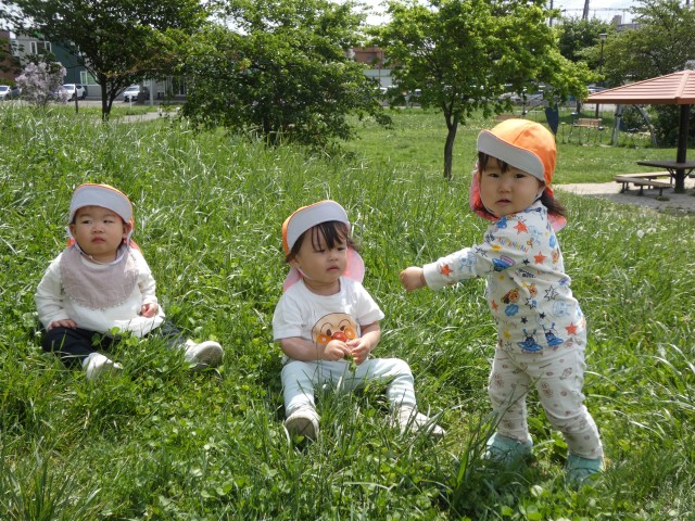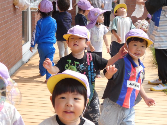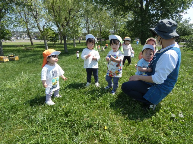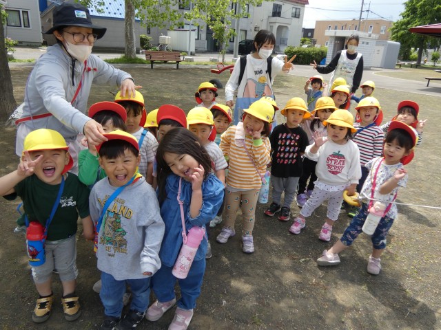 すみれさんがいるライラック公園に着いた時には、もう遊び終えて帰る支度をしたところでした。「楽しかった?」と聞くと、みんな元気に手を上げてくれました。気持ちの良い日が続いています。いっぱいお散歩をして体力をつけていきましょうね。