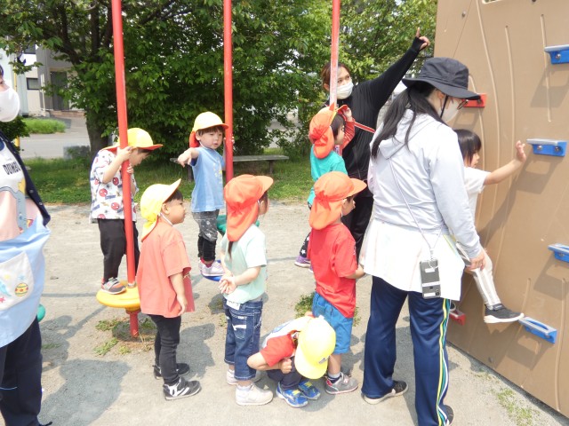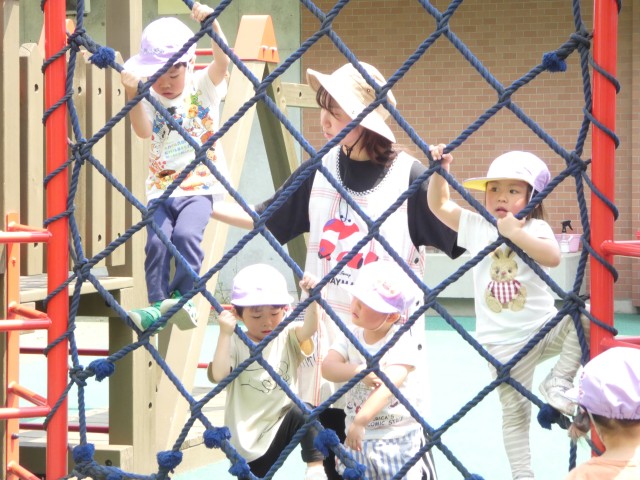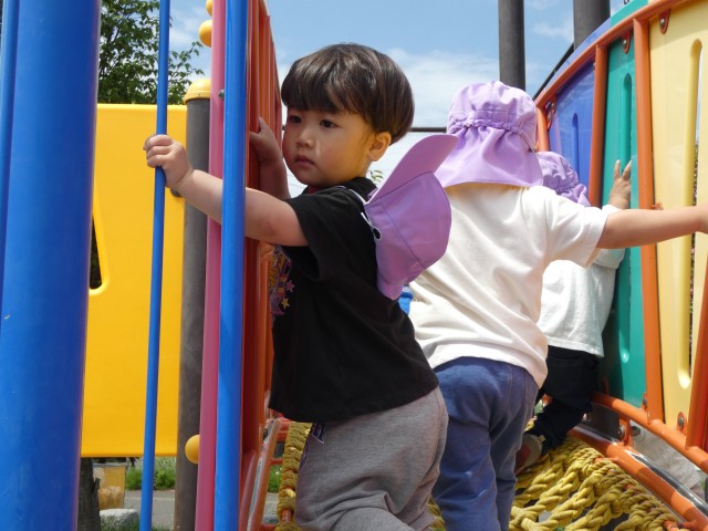さて、すみれさんはさくらこぶし公園まで行ってきました。大型遊具はちょっと難しい所もありましたが、先生が付いて少しずつできるように教えていました。クライミングの所では、やってみたい気持ちはあるものの、一番上まであと一歩のところまで来ると「怖い」と言って下りてしまう子も続出。上まで行けると「やった~!」ととっても嬉しそうでしたよ。