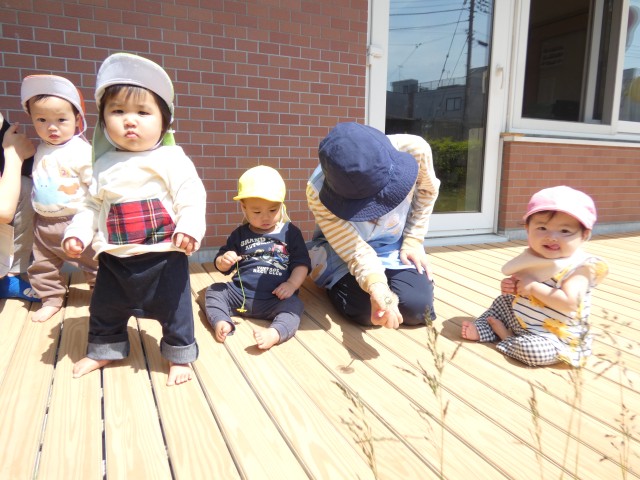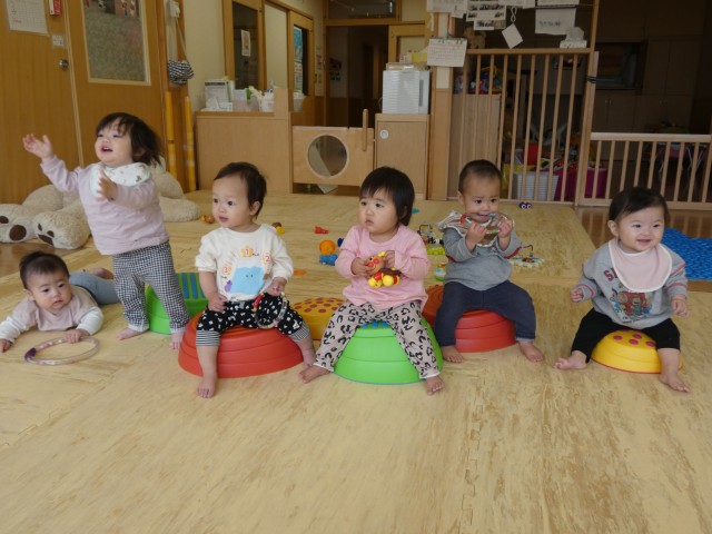 つぼみさんのお部屋を覗いてみたら、飛び石のような遊具にちょこんと座っていました。「かわいい~」カメラを向けると、何だか記念撮影のようになってしまいました。とってもご機嫌な赤ちゃんたちでした。
