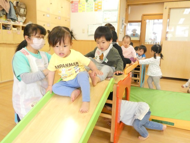 つくしさんは組み立て式滑り台で遊んでいました。よいしょよいしょと登って、ハイハイで橋を渡って滑ります。みんな順番を守って何度も滑っていました。滑り台の下の空間もお気に入りの場所で、入ったり出たりしていましたよ。