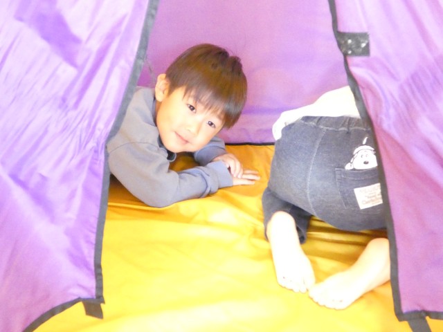 すみれさんがお部屋でかくれんぼをしていました。テントの中で頭を手で覆って隠れていたり、立てかけたマットの後ろに隠れたりしていました。段ボールの箱が何個か置いてありましたが、その箱の中に入って丸くなっている子もいましたよ。(体は半分以上見えているのですがね)