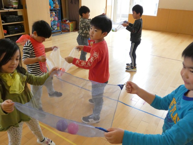 運動会の練習が始まったのでしょうか、ちゅうりっぷさんはフィンガーフラッグを回していました。この布の端には指を入れる輪が付いていて、反対側にはおもりが入っているので、クルクルと回すことができます。それから、お友だちとペアになってボールを落とさないように体を揺らしたりして遊んでいました。一枚の布で色々な遊びができますね。