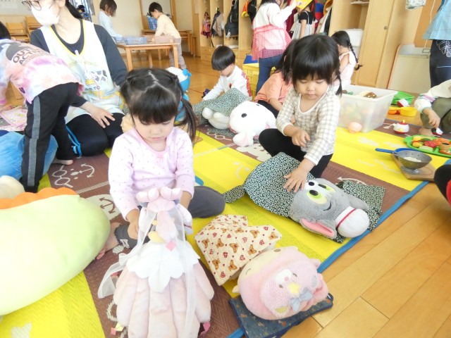 すみれさんはぬいぐるみにお布団をかけて、トントンとしていました。いつもお昼寝の時、自分がされていることを、ぬいぐるみにしていておもしろかったです。トントンする時は正座なんですね。そして優しくトントンしていました。