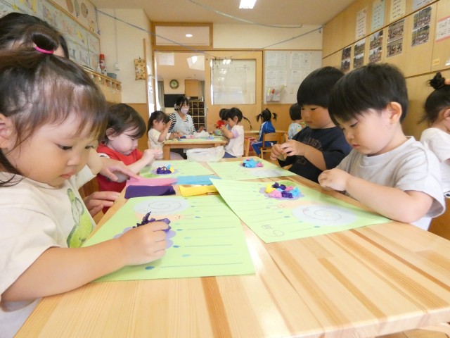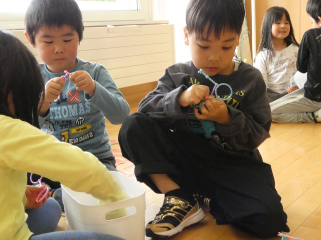 さくらさんは、フープを使って体育遊びをした後、ものすごく伸びるスライムで遊びました。先生が見せてくれると「わぁ~!」と歓声が上がりました。これは楽しみですね。