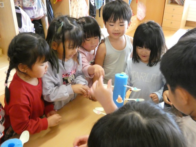 さくらさんはお部屋でボール回しなどの体育遊びをした後、棒倒しや折り紙などのコーナーに分かれて自由に遊びました。写真は先生手作りのバランスタワーです。スプーンにボンボンを2個3個と乗せていき、バランスを崩して倒れたら負けです。目新しいおもちゃに、みんな集まってきていました。