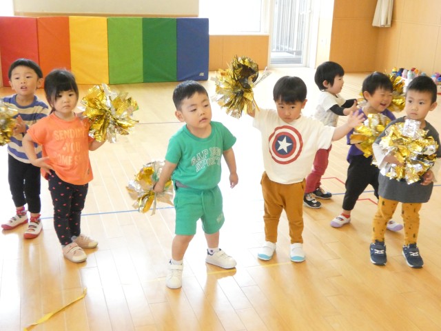 来月末に行われる運動会の練習が始まりました。すみれさんは初めてポンポンを手にし、うれしくて自由に振っていました。振付なんて関係なく楽しそうにクルクルと回って楽しんでいましたよ。振るとカシャカシャと音がするので、それが楽しいんですね。