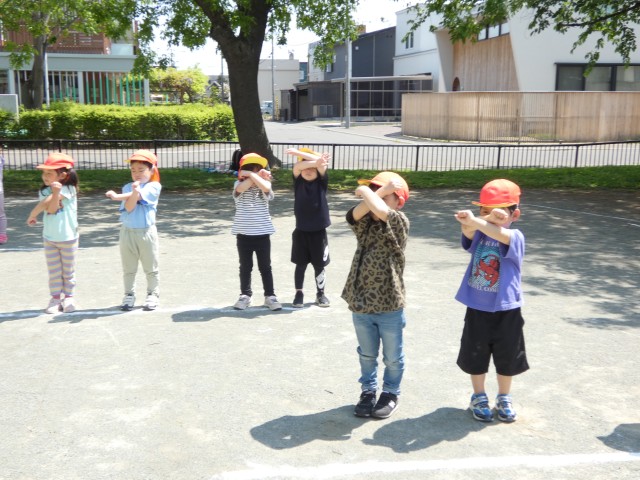 さくらさんも公園に行って、お遊戯の練習を始めました。「最初のポーズは、腕を交差して顔を隠します」と先生が見本を見せてくれましたが、いろんなポーズになっていておもしろかったです。これから少しずつ振り付けも練習していきますよ。