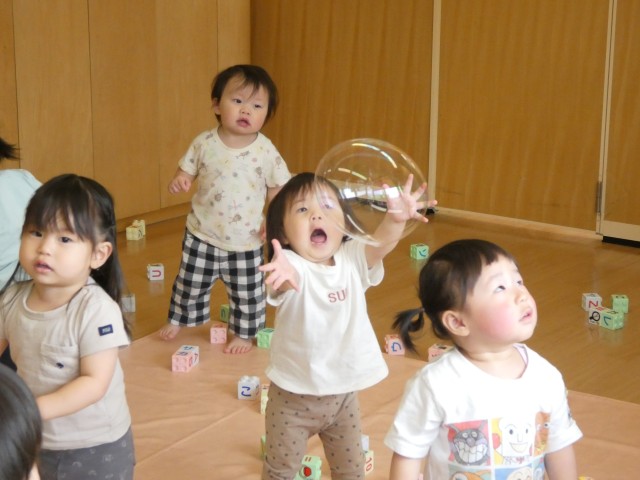 今日も良い天気!朝からすのこで遊んでいたたんぽぽさんです。先生がシャボン玉をしてくれました。風に乗って飛んでいくシャボン玉を追いかけてすのこを走っていましたよ。
