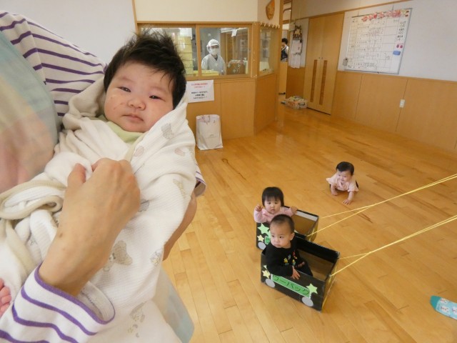 つぼみさんは、段ボールの車に乗せてもらい、ドライブをしていましたよ。ハイハイが上手なお友だちの方が早い感じでしたが、小さな赤ちゃんも抱っこで見守っていました。