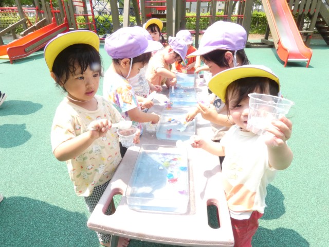 さて、今日も暑い日になったので、園庭で遊んでいたたんぽぽさんに、先生方が霧吹きでミストをかけていました。子どもたちは大喜びで、細かい水を浴びて少しだけ涼しい気分を味わっていました。こんなに暑いのだからと、水遊びもしました。スプーンでおもちゃをすくってコップに入れるという遊び、スプーンの使い方が上手になればいいですね。
