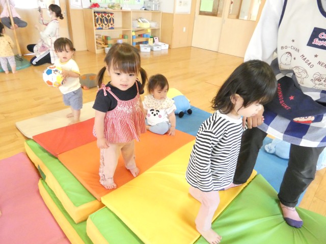 つくしさんがホールでマットの小山やボールで遊んでいました。先生も一緒になってマットの小山でジャンプしていましたよ。先生がジャンプするとマットが大きく揺れて、マットの上に立っていた子どもたちも揺れていました。先生が大好きな子どもたちですので、先生と一緒にというのが嬉しいようでしたよ。