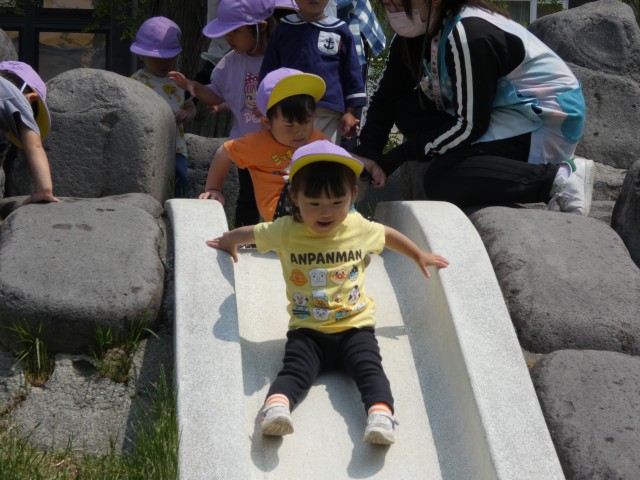 すくすく公園に出かけて行ったのはたんぽぽさんです。初めて行った石の公園ですので、公園では「お友だちを押したらだめ」とか「石の上に立ったらだめ」など、危なくないように注意を促してから遊び始めました。見ているとちゃんと注意して歩いていて上手に滑り台も滑っていましたよ。