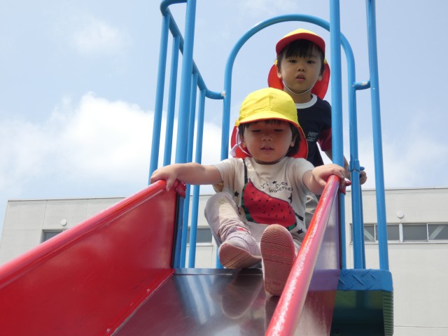 すみれさんは第二保育園の近くの亀の子公園まで行ってきました。第二のお友だちも来ていて、一緒に仲良く遊びました。ここの滑り台は、とても高いんですよ。「わぁ、高~い!」と思わず声が出ていましたよ。