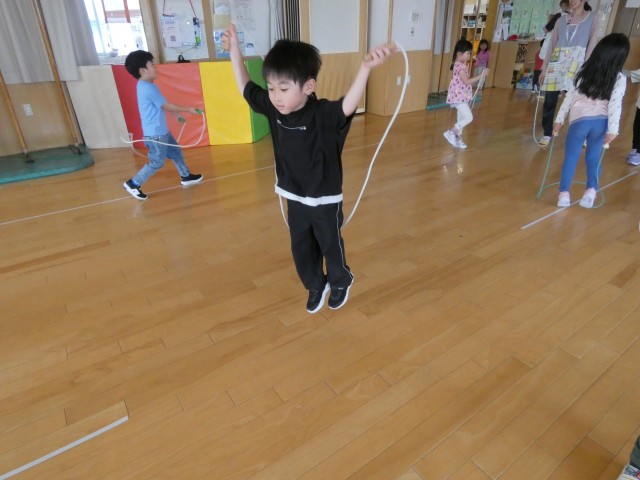 ちゅうりっぷさんが縄跳びの練習をしていました。見ていると、縄を後ろから前に回す瞬間に飛んでいる子が多かったです。だから繩が床に着いた時には足が床に着いてしまっているんです。「繩が床に着いた時に飛ぶんだよ」と声をかけ、何度かやっているとたまたまうまく飛べた瞬間がありました。「そう!やった!」と一緒に喜ぶと、うれしそうなお顔になってさらに練習を重ねていました。気が付くと普通に跳べるようになっていました。私も嬉しくなりました。