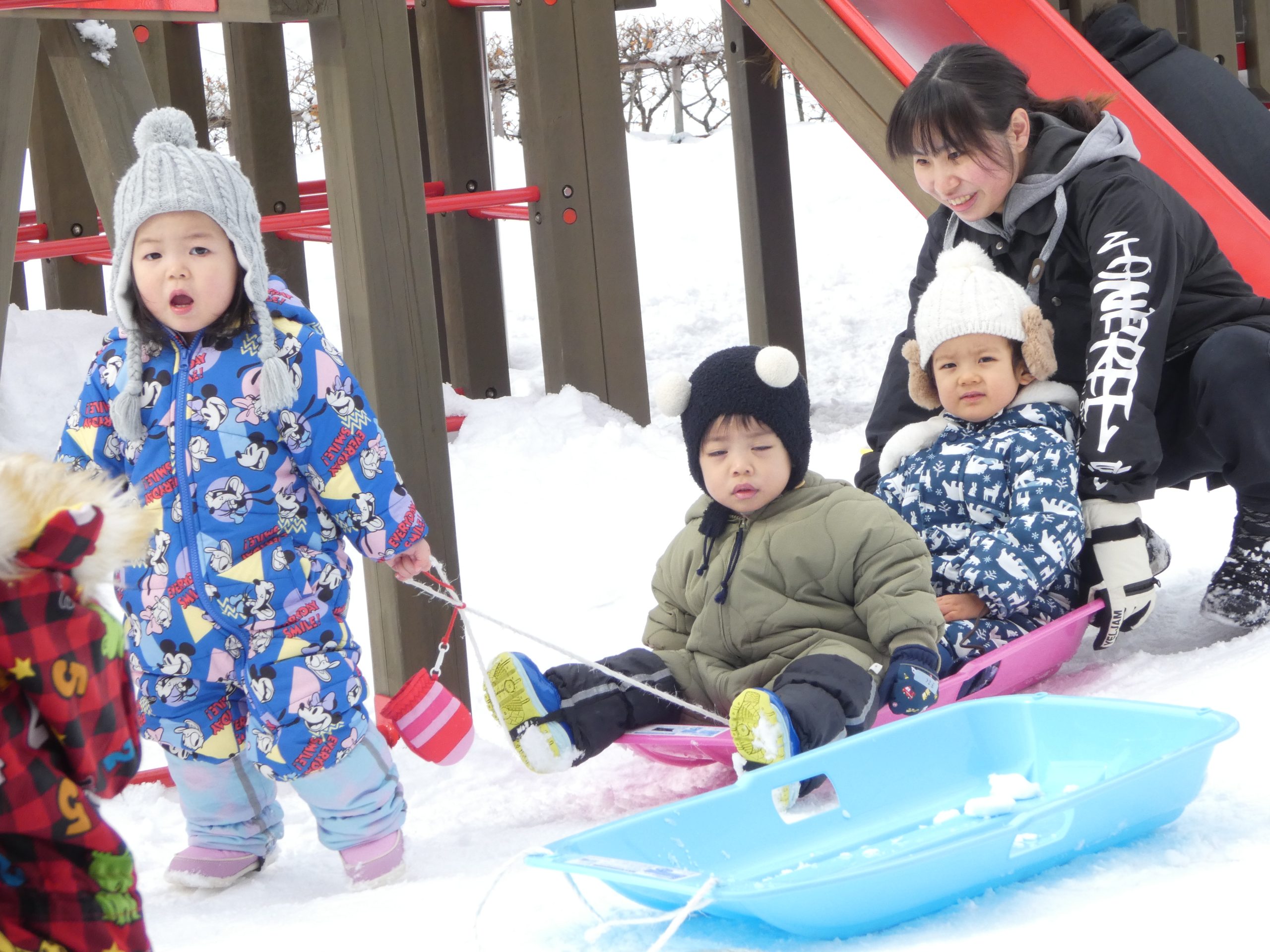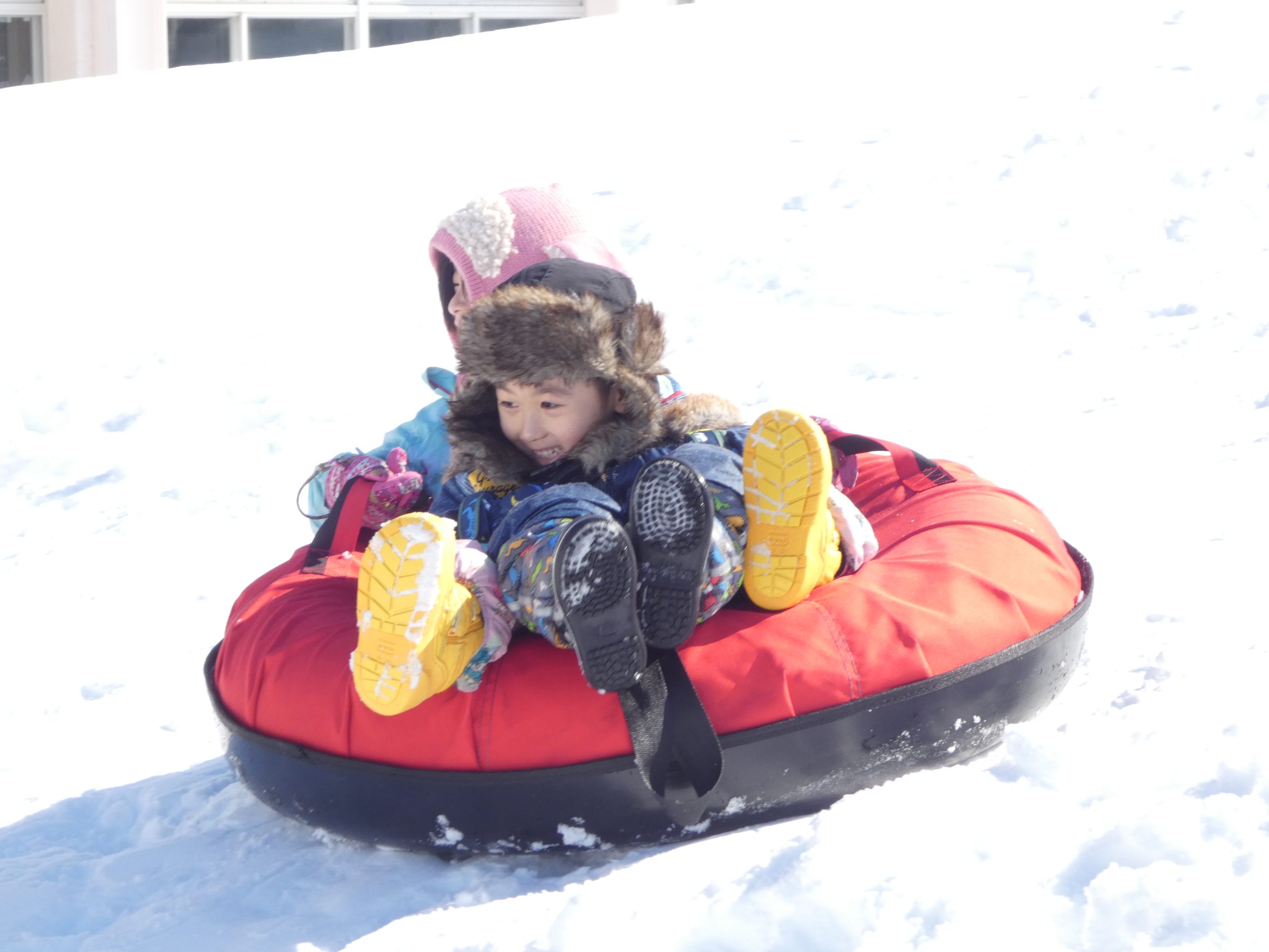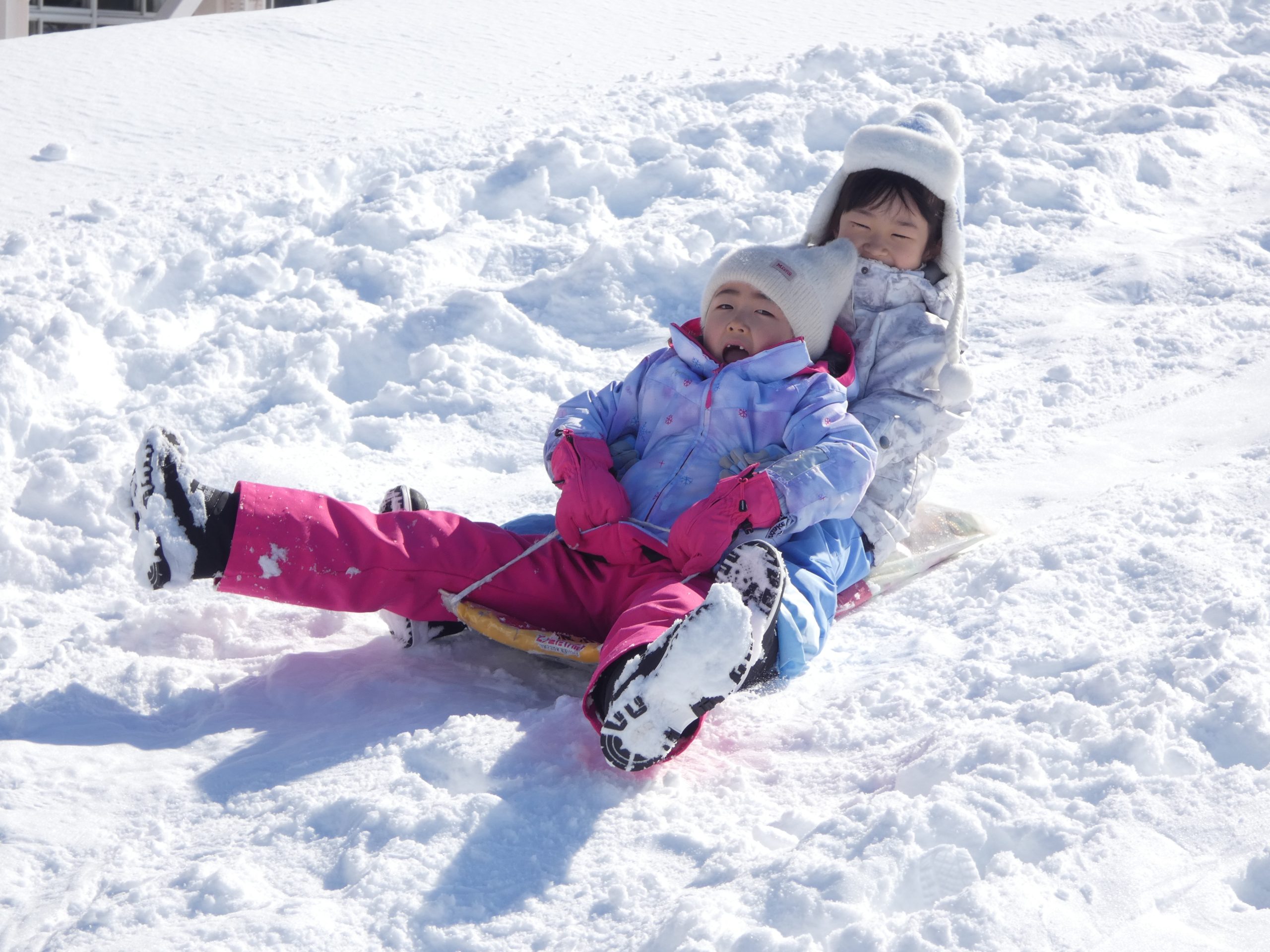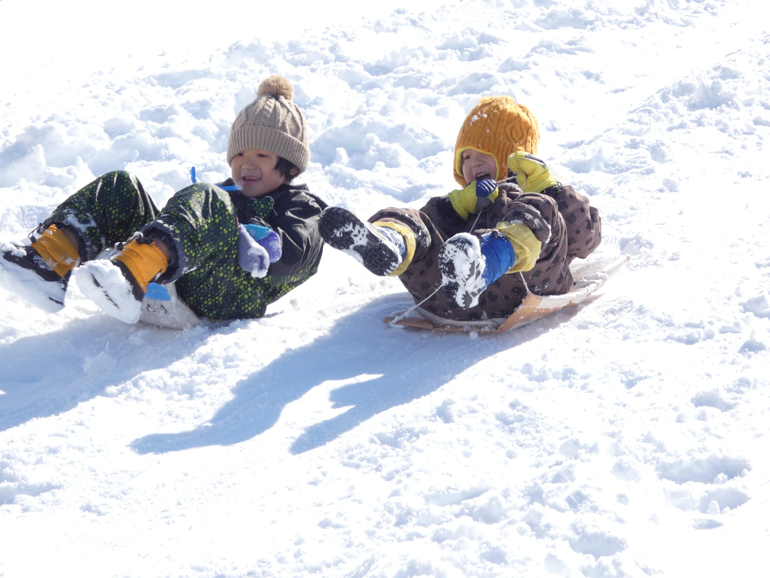 連休中に降った雪が結構深くて、子どもたちは小山目指して雪を漕いで行きました。小山の上からの斜面はなだらかで、いくら足で漕いでも滑っていきません。それでも何度かみんなで滑っているうちに道ができ滑りやすくなってきました。