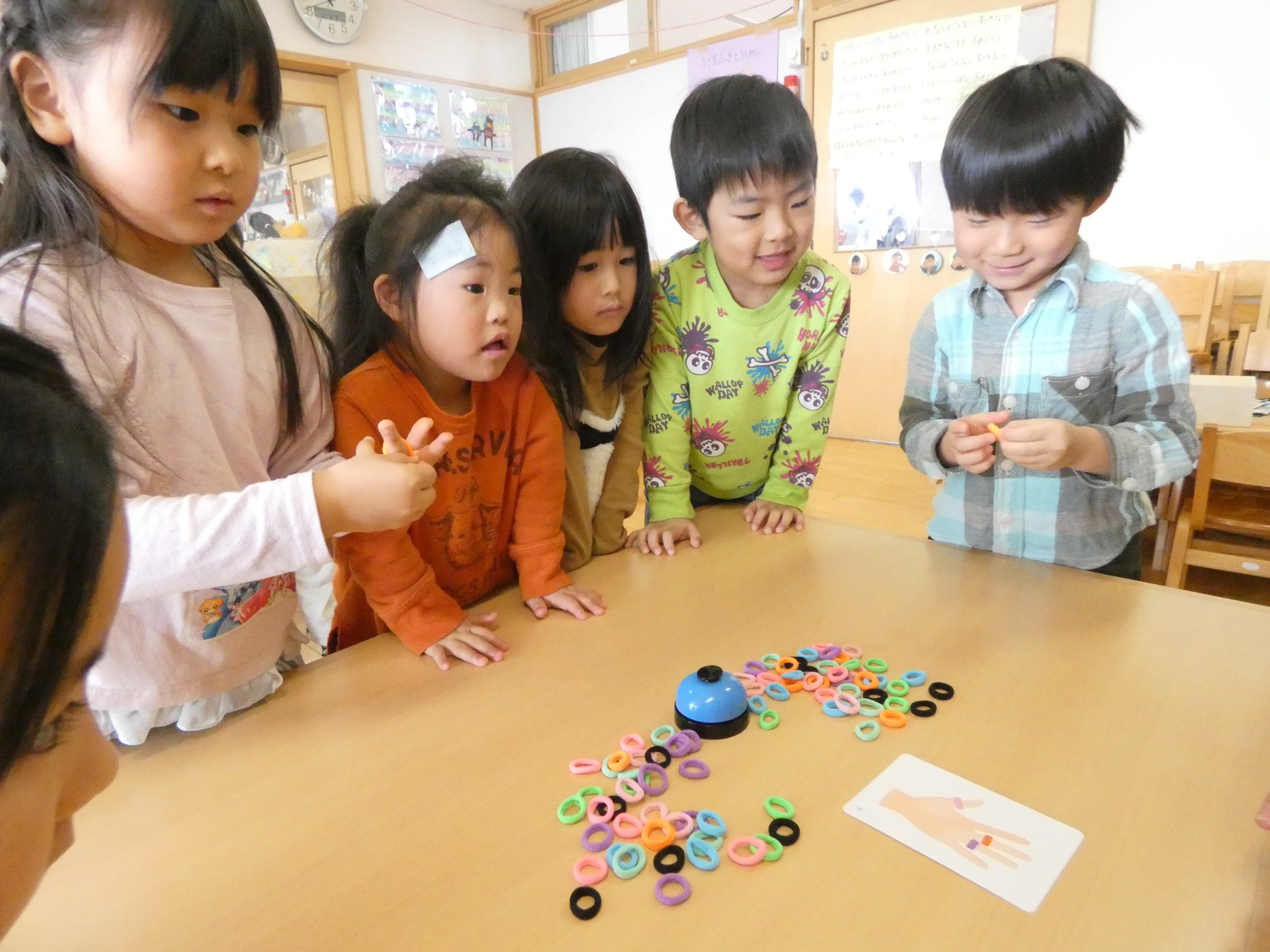 さくらさんのお部屋では、目新しいゲームがたくさんありました。手の指にカラーゴムをかけた絵のカードを見て、どの指に何色をかけているのかを見て、自分の手に同じようにゴムをかけていくという競争。お友だちと一緒にどっちが早く正確にできるかを競います。