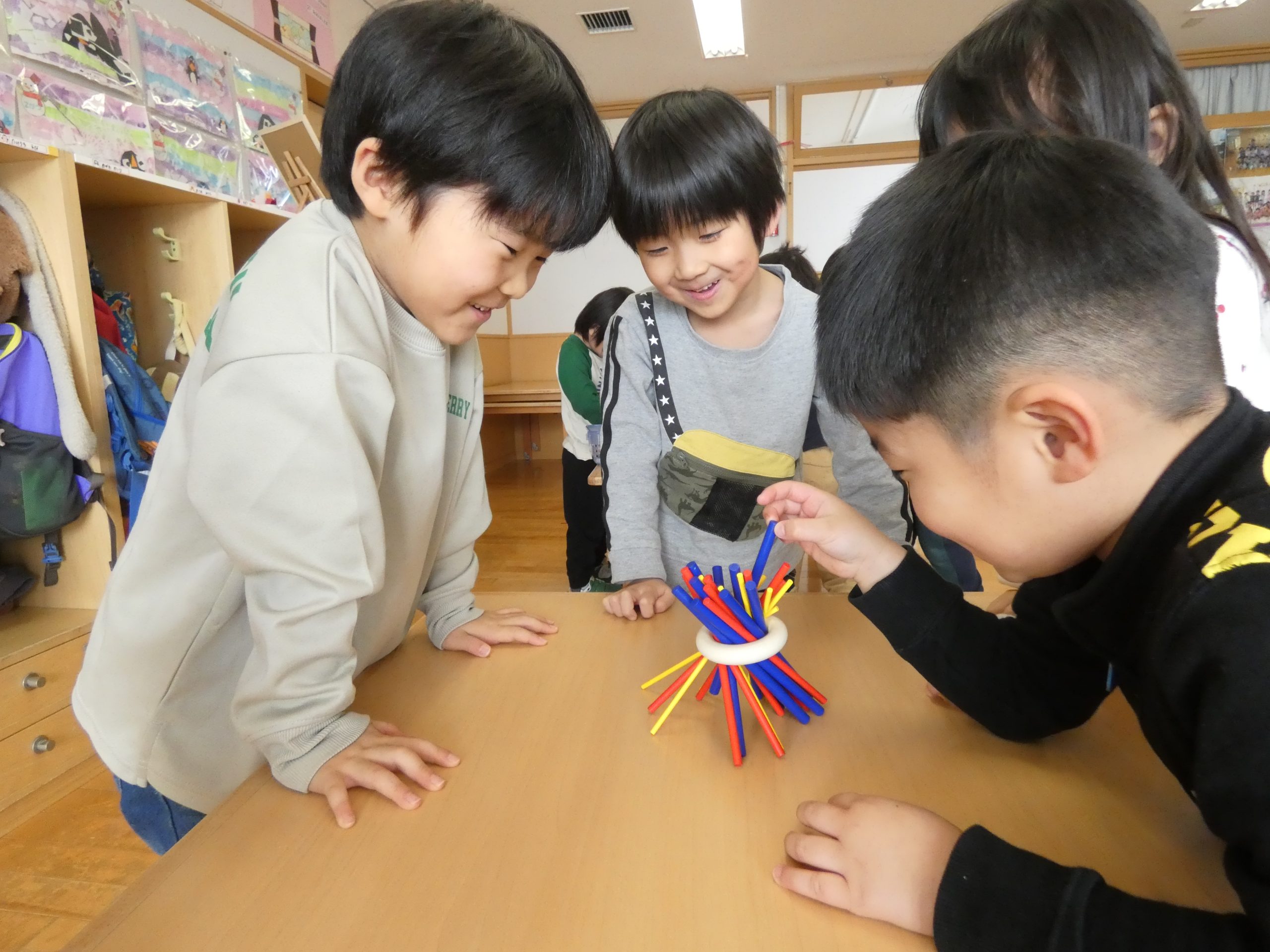 もう一つのゲームも初めて見ました。たくさんの色付き棒を束ねて立てておき、サイコロを振って出た色の棒を抜いていきます。抜いていってグチャッと倒れてしまったら負けです。『これは大丈夫かな?』とドキドキしながら一本を選んで引き抜くのが楽しそうでしたよ。