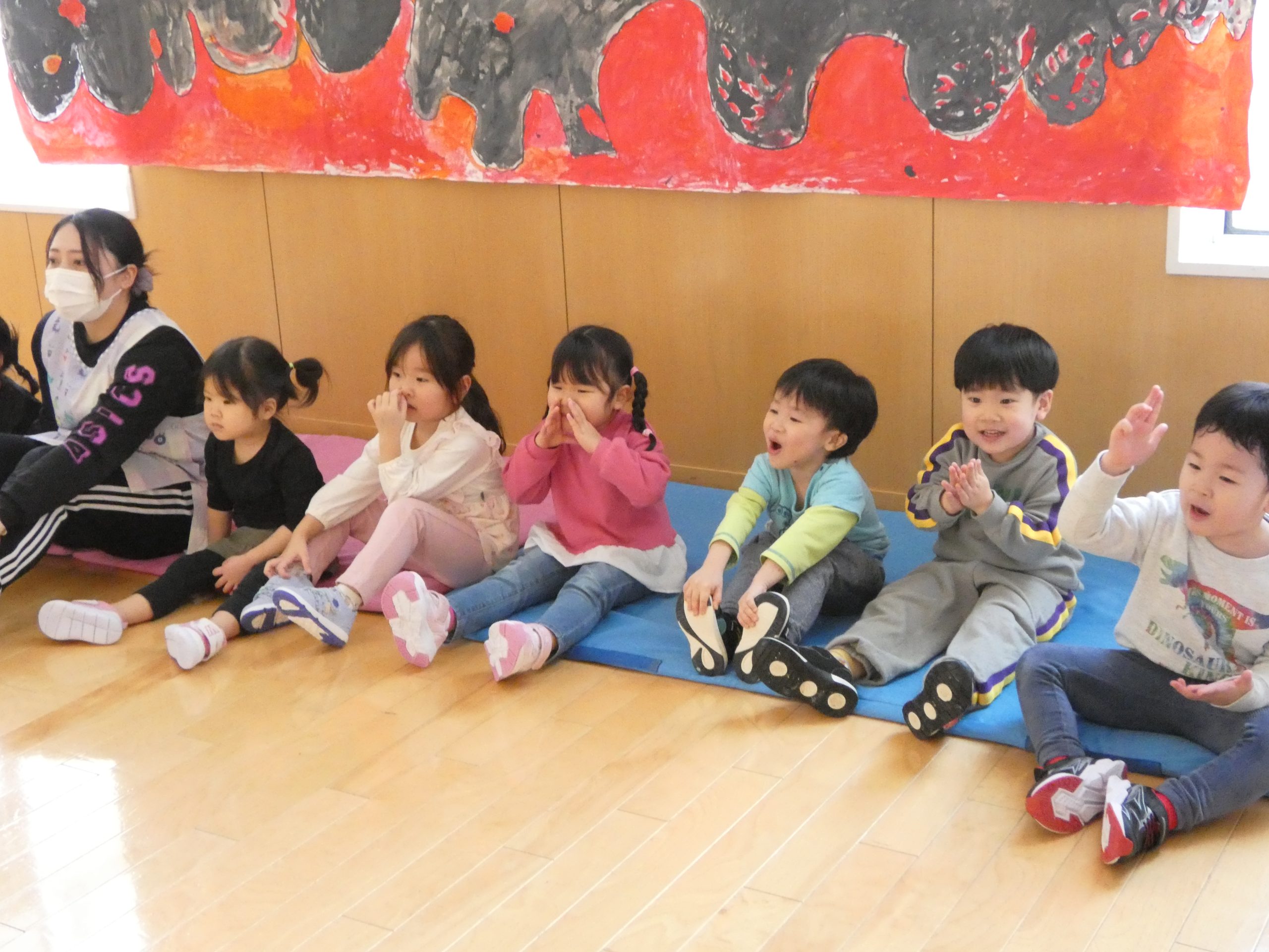 ホールでは、すみれさんがイス取りゲームをしていました。負けたお友だちは壁に沿って座って、他のお友だちを応援していました。ゲームに負けると悔しくて、気持ちが切り替えることが難しいこともあります。でも、その気持ちをぐっと抑えて、お友だちを応援できるという姿を見て、成長を感じます。