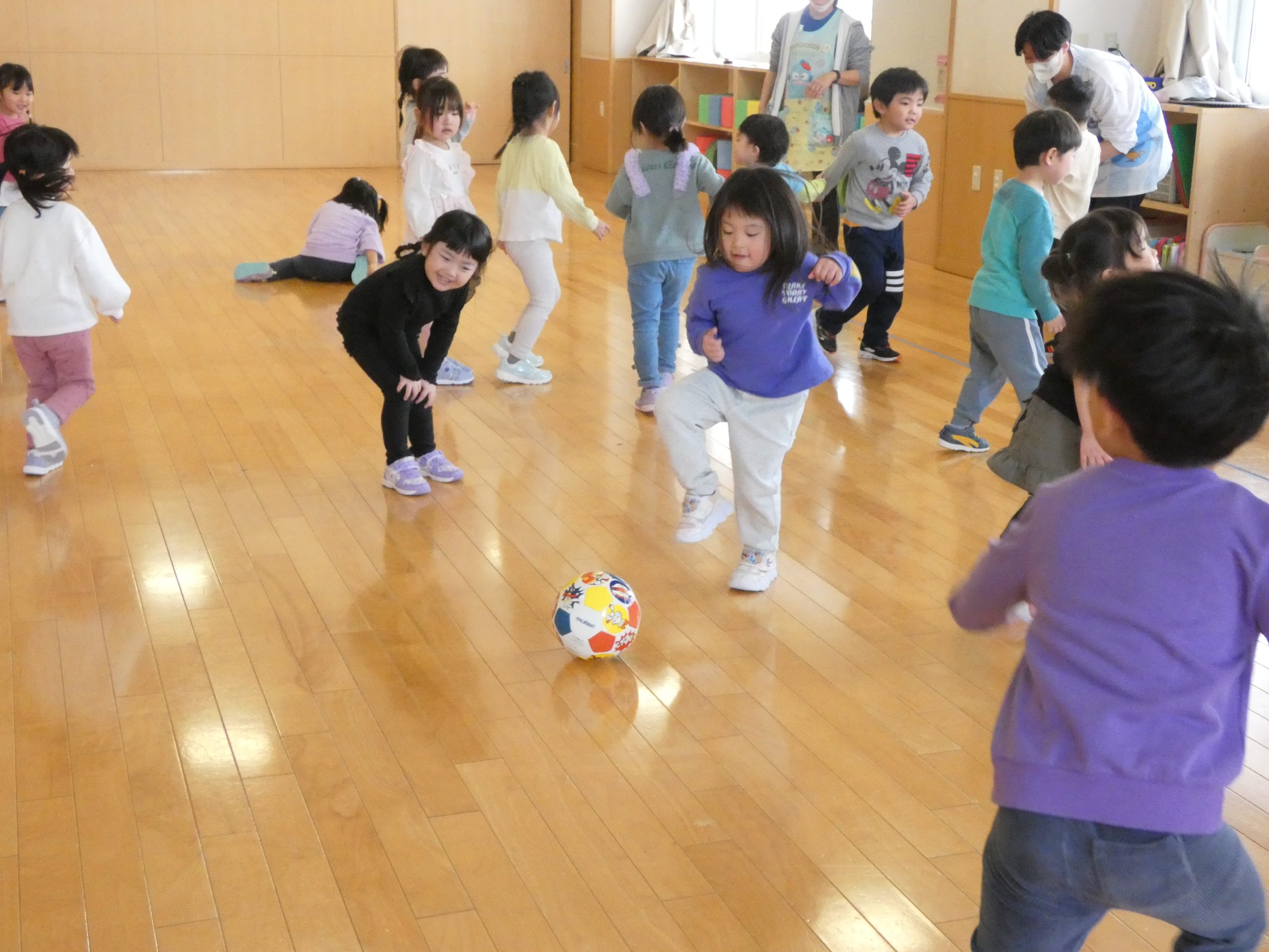 それから、子どもたちの大好きな転がしドッジボールをしました。ボールが当たると自分もオニになって外に出なければいけません。でも、見ていると当たっても当たっていないそぶりで逃げていく姿もありましたよ。先生に名前を呼ばれるまではセーフというルールなのかもしれません。