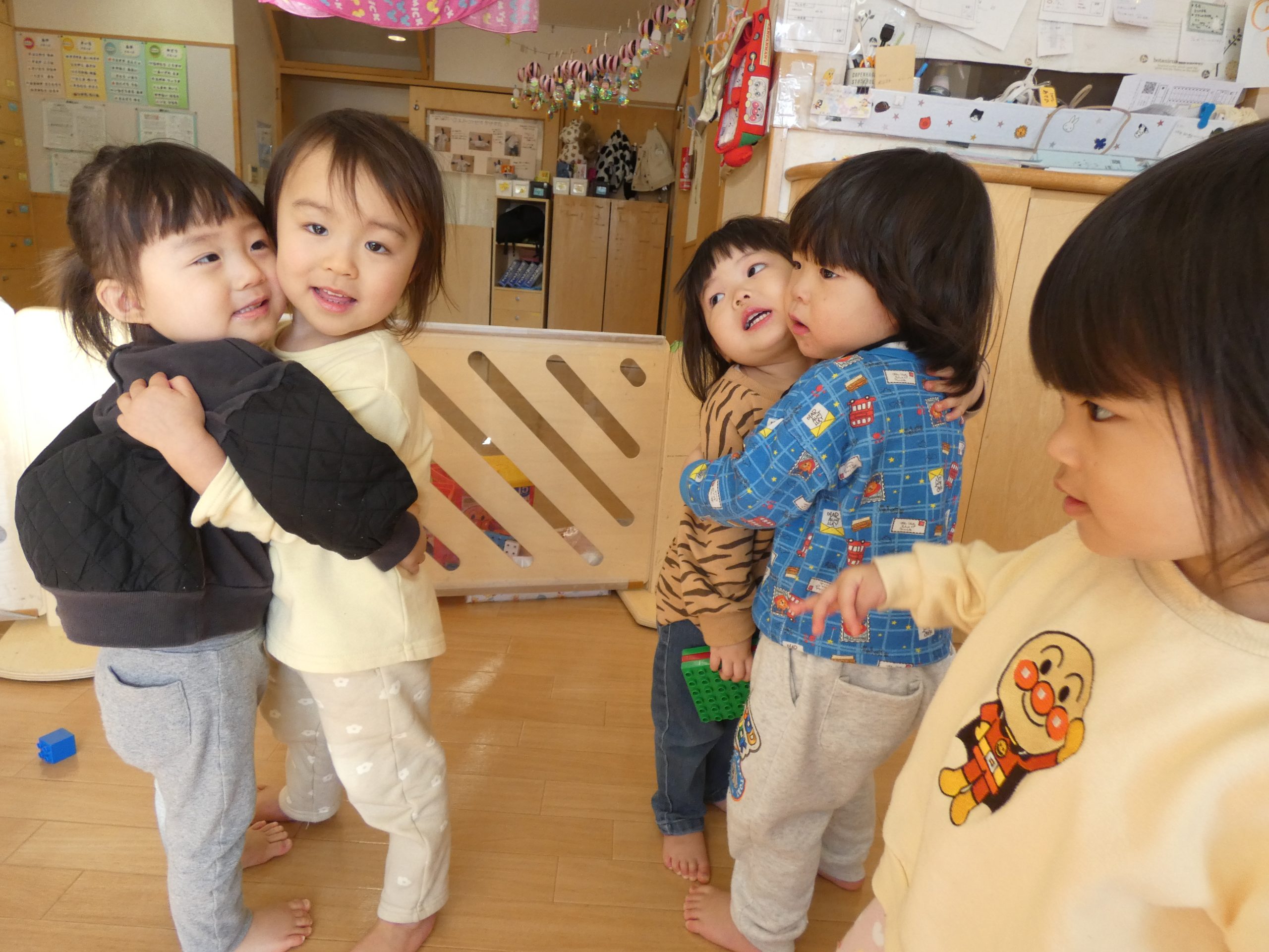 朝の時間につくしさんを覗いてみたら、子どもたちが抱き合っていました。「大好き大好きしてるの?」と聞いてみたらニッコリ。そして、その輪が広がっていき、あちこちで抱き合っているお友だちが増えていきました。かわいいですね。