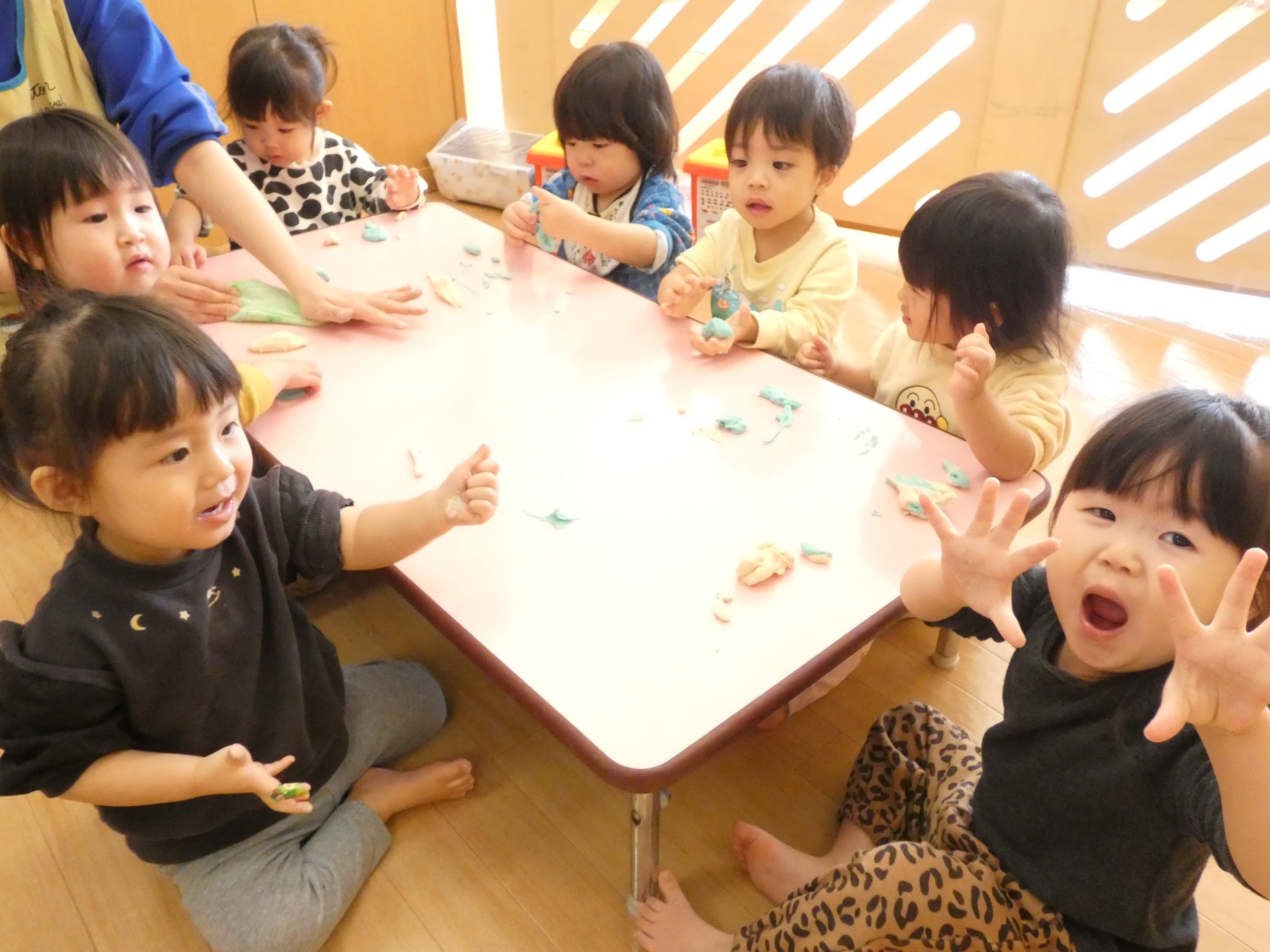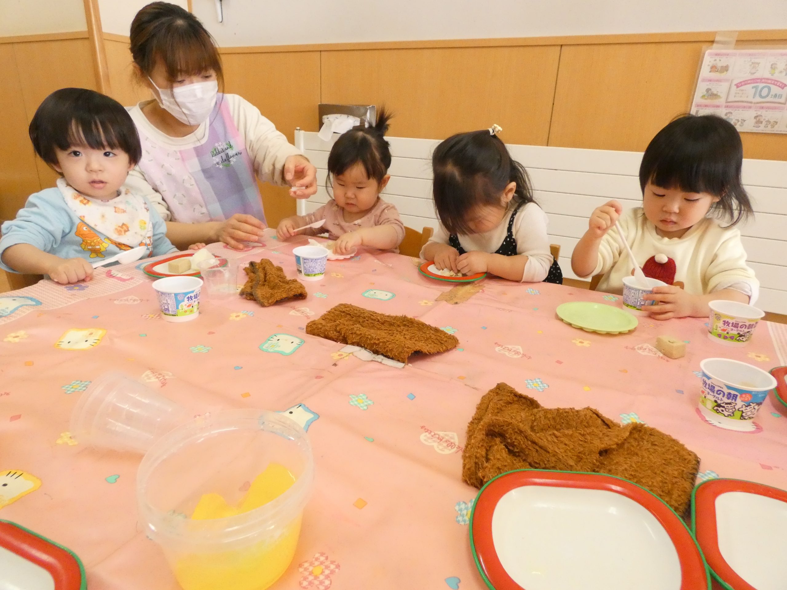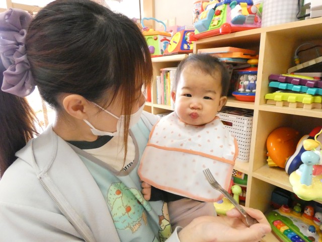 小さなお友だちが増え、14名となったつぼみさんで、今一番小さなお友だちです。まだ慣らし保育中ですが、おやつのオレンジを大きなお口を開けて食べていましたよ。もうすぐつくしさんになるお友だちはフォークを持って自分でお口に運んでいます。一年の成長を感じています。