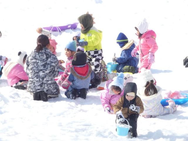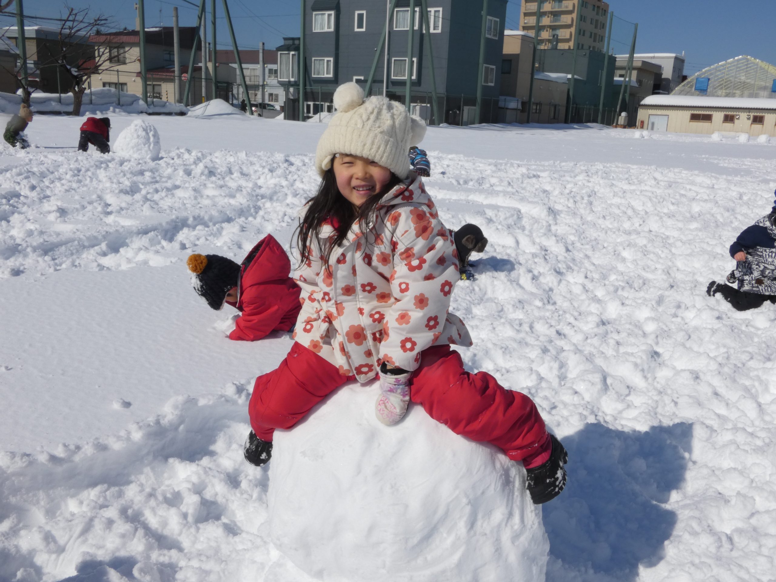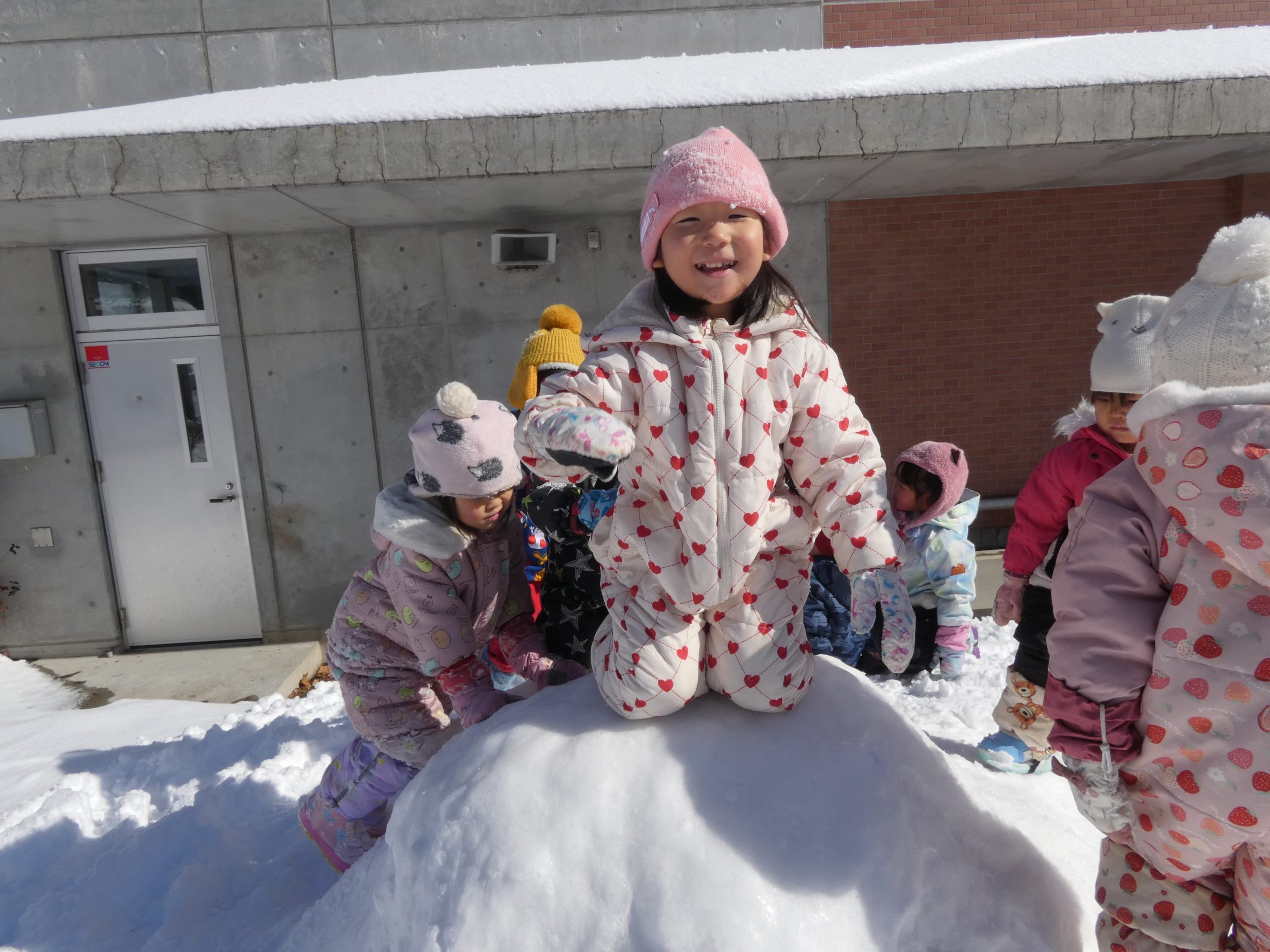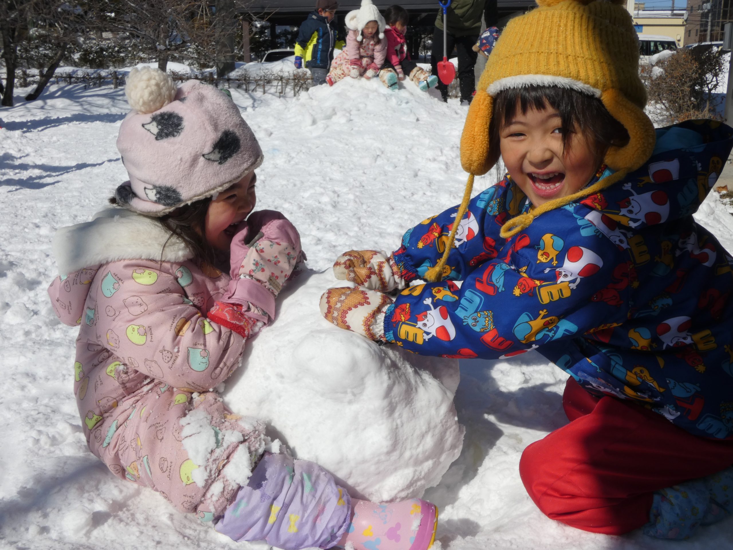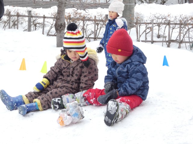 雪玉を転がして大きくしていたお友だちが、雪玉を囲んで遊んでいました。写真を撮られるのが照れ臭かったのでしょうか、ずっと目を合わせずにいましたよ。お友だちと一緒が嬉しいんですね。