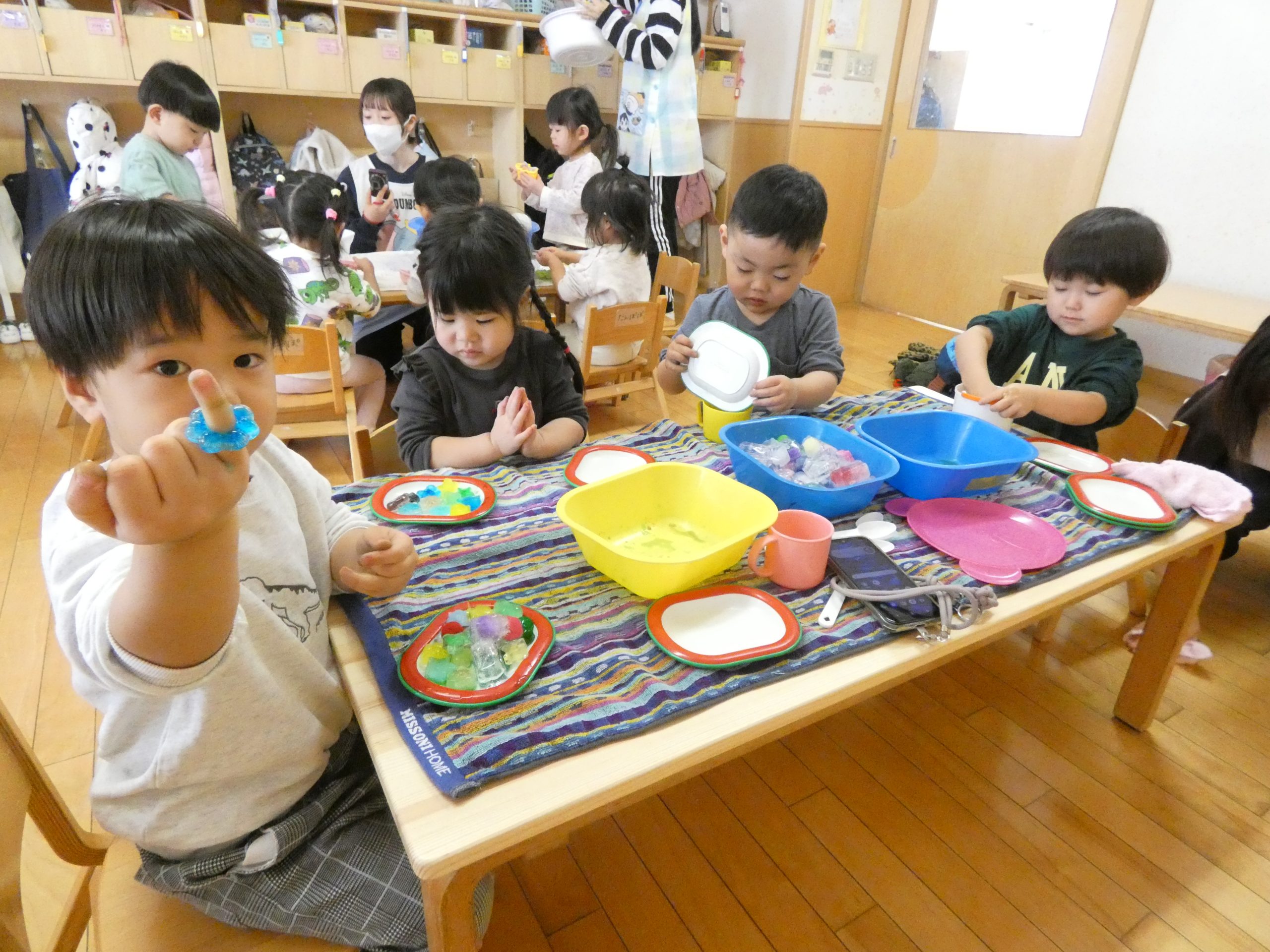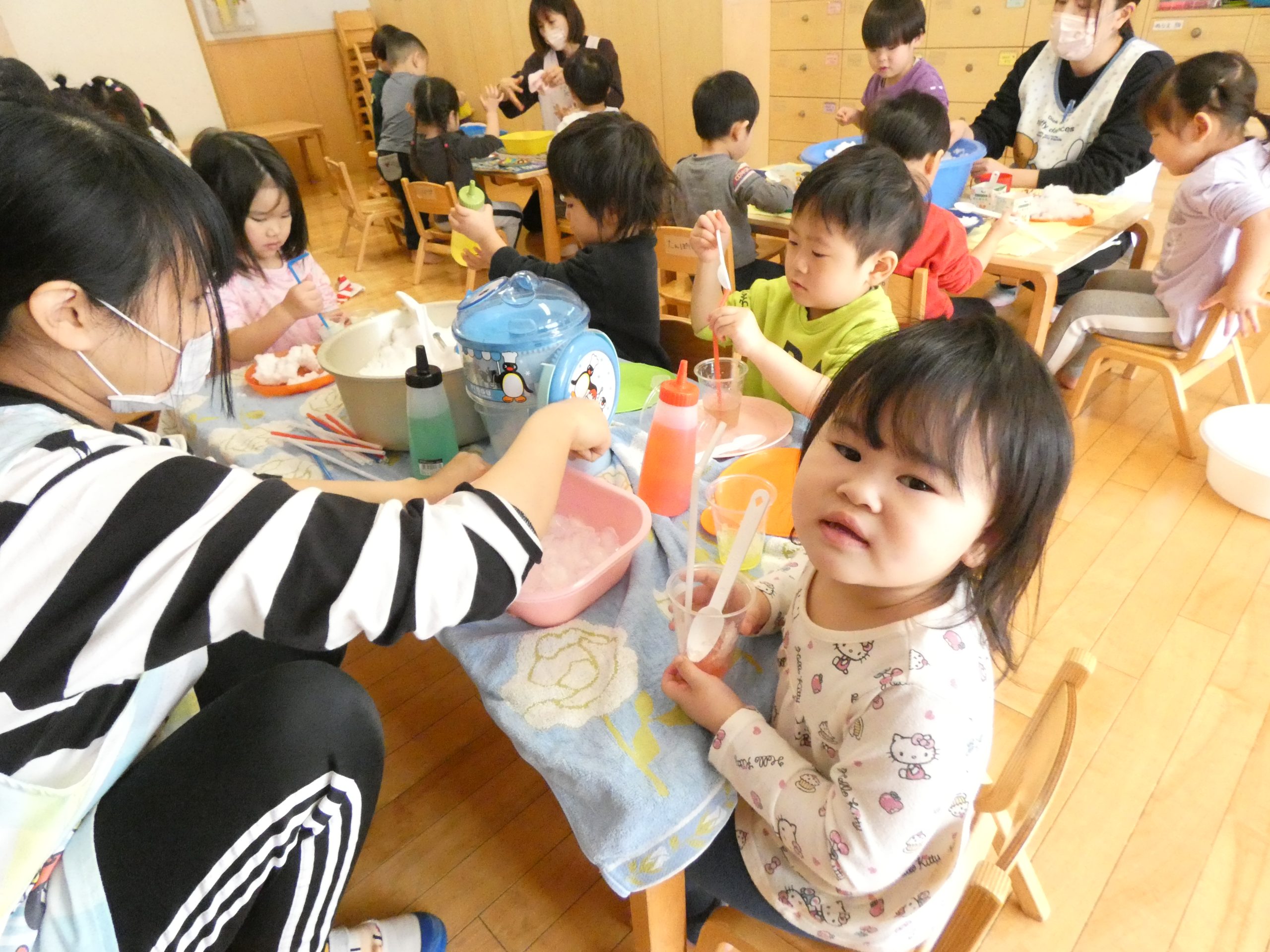 先生が作ってきた氷の指輪を指に入れて遊んだり、型に入れたりしていました。色水を加えると、本物のかき氷のように見えましたよ。