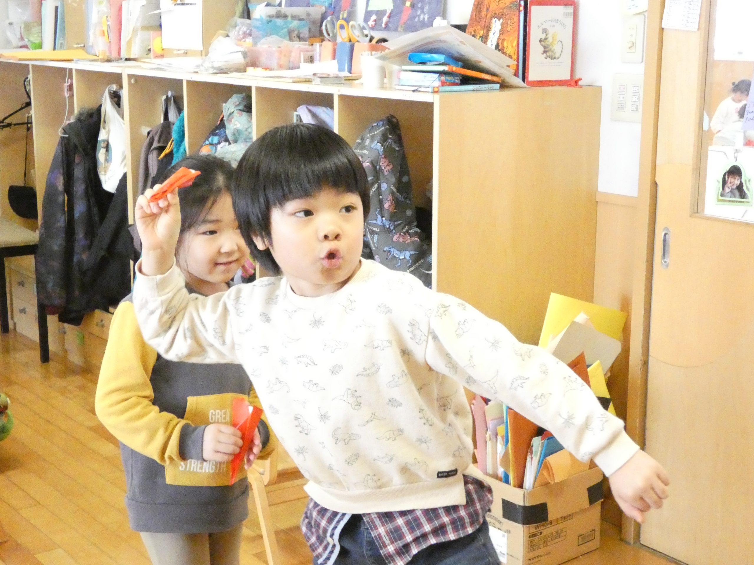 ちゅうりっぷさんもお部屋で自由遊び中。好きなおもちゃで遊ぶお友だちが多い中、数名が折り紙で飛行機を作って、的当て競争をしていました。なかなか真っ直ぐに遠くまで飛びませんね~。だからもう一回、もう一回と繰り返し投げていましたよ。