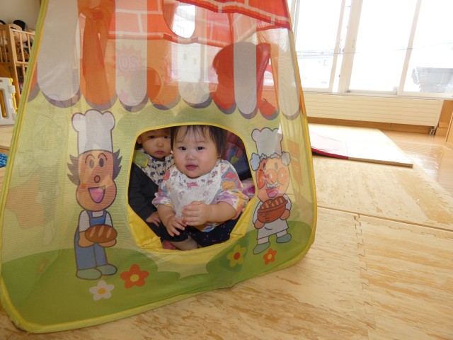 さくらさんはお部屋で自由遊びをして過ごしていました。お友だちを抱っこして遊んでいるお友だちがいました。仲良しなんですね~。抱っこされる方もする方も嬉しそうでしたよ。