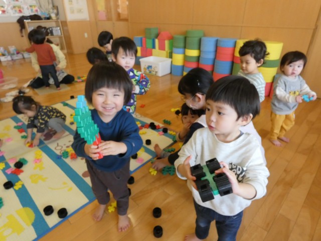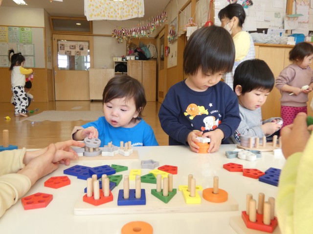 つくし組のお友だちは園庭で遊んでいましたが、お外に行けないお友だちがお部屋で遊んでいました。これも見たことのないおもちゃですね~。色のお勉強も、数のお勉強もできるんですね。お友だちと一緒に遊んでいましたが、『赤は一個しかないから1の所に置こう』という考えではないようでした。今はカチャッと棒に色のついた積み木を通していく遊び方が主流ですよ。