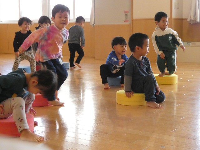 たんぽぽさんは、ホールでイス取りゲームをしました。イスが減るのではなく、必ず全員座れます。「3・2・1」と先生がカウントをする間に座りますよ。歩くときは、青い線の外側ですよ。色々とお約束を守って遊びましたよ。