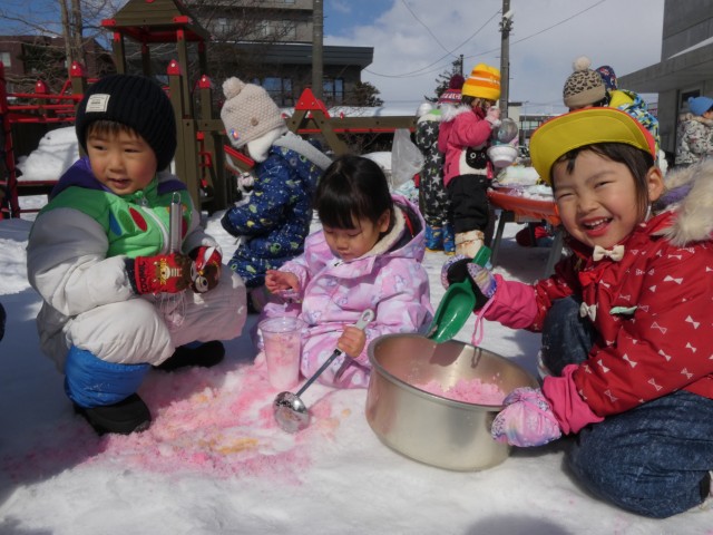 園庭にはすみれさんが出てきました。お玉や泡立て器を手に、お料理をしているようでした。コップに雪を入れて、ピンク色の色水をかけたら、おいしそうなパフェみたいでしたよ。