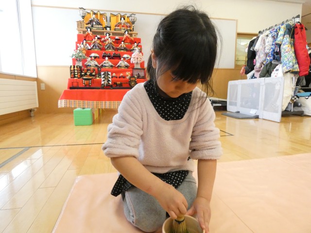 毎年、おひなさまと一緒にお茶を点てている写真を撮っているのですが、気が付けば来週の月曜日は3月3日で、おひなさまを片付けてしまうため、急いで写真を撮りました。「背筋を伸ばして肘を曲げて」と格好良く見えるようにと頑張りました。背中をまっすぐにすると肘もまっすぐになり、肘を曲げると背中も丸くなるんですよ。ちょっと難しい格好でしたが、自分で点てたお茶の味は「この前と同じくらいおいしい!」とのことでしたよ。