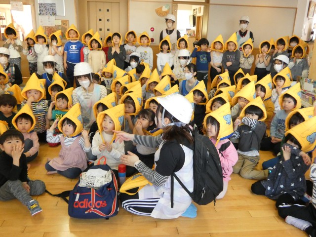 今日は避難訓練をしました。給食室から火が出たという想定で放送が入り、子どもたちは静かに集まってきました。ちゃんと防災頭巾をかぶって、先生方もヘルメットをかぶり避難用のリュックを背負っていました。『おかしも』の確認をし、スーパーなどでも火事になった時は、「姿勢を低くし口をお洋服の袖などで覆って避難しましょう」とお話しています。
