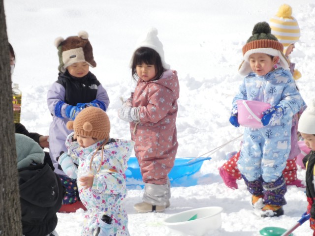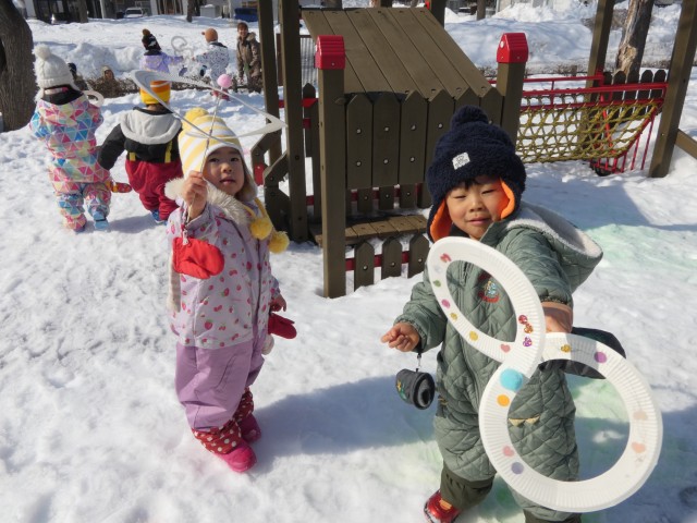 さくらさんとすみれさんはことぶき公園で雪と戯れていました。先生も一緒になって遊んでいるので、子どもたちか先生か区別がつかなかったですよ。明日から3月、雪遊びもあと1か月位しかできませんね~。冬の遊びを満喫しましょうね!