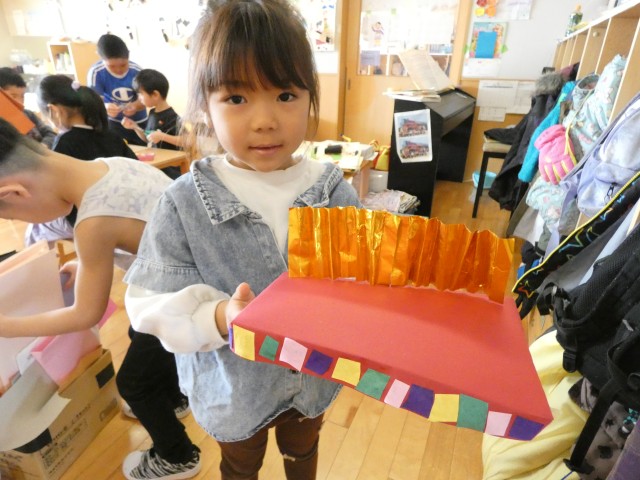 ちゅうりっぷさんはおひなさまの制作をしていました。昨日もお内裏様とお雛様をじっくりを観察して作っていましたが、今日は「ステージ!」を作ったそうです。ステージという言い方がおもしろいなぁと思いました。