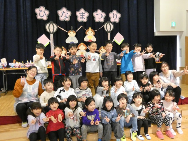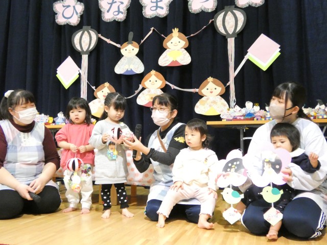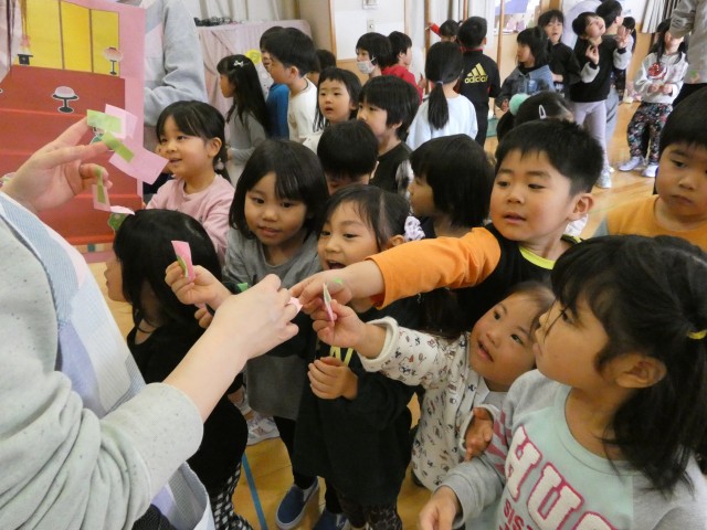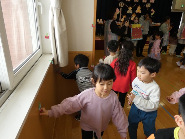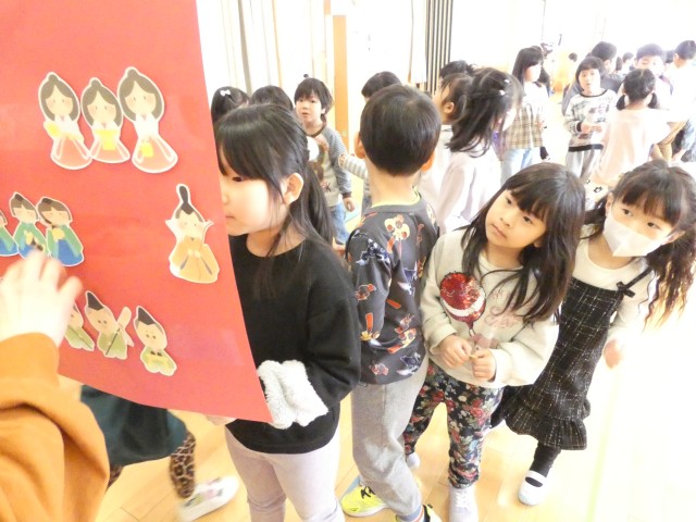 各クラス記念撮影の後、上の3クラスでおひな様を完成させるゲームをしました。クラスの色の小さな画用紙が色々な所に貼られているので、それを見つけて先生の所に持っていきます。画用紙を開いて数字が書かれていたら、その数字のおひな様を飾っていきます。ちゅうりっぷさんの画用紙には『はずれ』がたくさん入っているので、なかなか完成しませんでしたよ。みんなで画用紙を見つけて協力してひな人形を飾りました。
