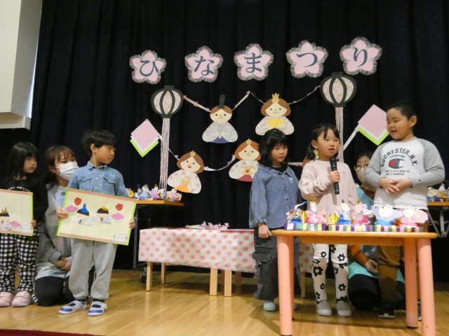 今日は3月3日、ひなまつりです。まず、各クラスで制作したおひな様を代表者が見せてくれました。それぞれ、どうやって作ったのかとか苦労した所を発表しました。それぞれの工夫がわかり、とってもかわいくできましたね。