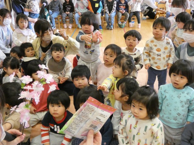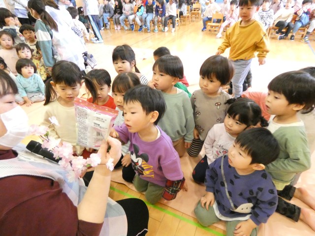 先生がひなまつりの由来や、ひなあられの色についてなどのお話をしてくれました。ひなあられの色(桃色・緑・黄・白)は春夏秋冬を表しているそうですよ。桃の花は厄除け・長寿という力があるとのことですよ。