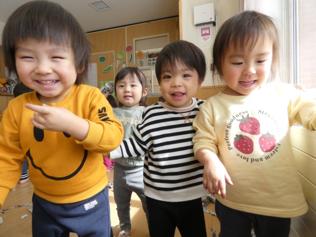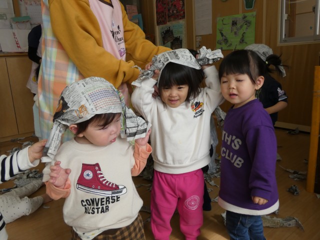 つくしさんのお部屋では新聞紙で遊びました。新聞紙は細かくちぎって雪にしたり、丸めてボールにしたり、大きいままで帽子にしたりと、色々なものに変身させて遊んでいました。