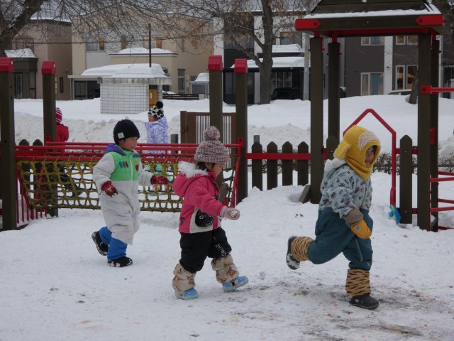 大雪になりそうと覚悟をしていましたが、今のところそれほど降ってきていないですね。でも、まだまだ注意が必要ですね。昨夜から降り積もった新雪は、子どもたちの遊びにはちょうど良い感じで、ソリや雪玉作りを楽しんでいました。