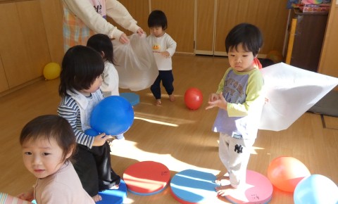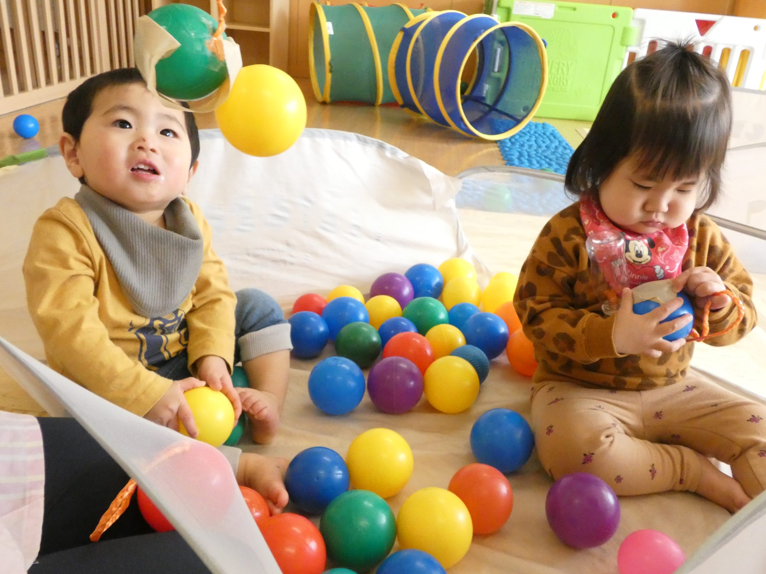 それから、今日は先生お手製のボールを使った釣りで遊びました。両面テープを貼ったボールにはヤクルトの竿が付いていて、ボールプールの中のボールにくっ付けてボール釣りをしようというわけです。一度に3個もくっついてきてとっても楽しんでいましたよ。