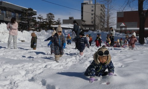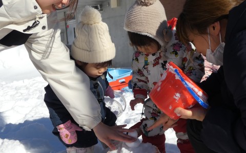 さて、今日は暖かかったですね。昨夜降った新雪がふわっと積もって、雪遊びには最適な日でした。つぼみさんも園庭に出てきて雪の感触を楽しんでいましたよ。